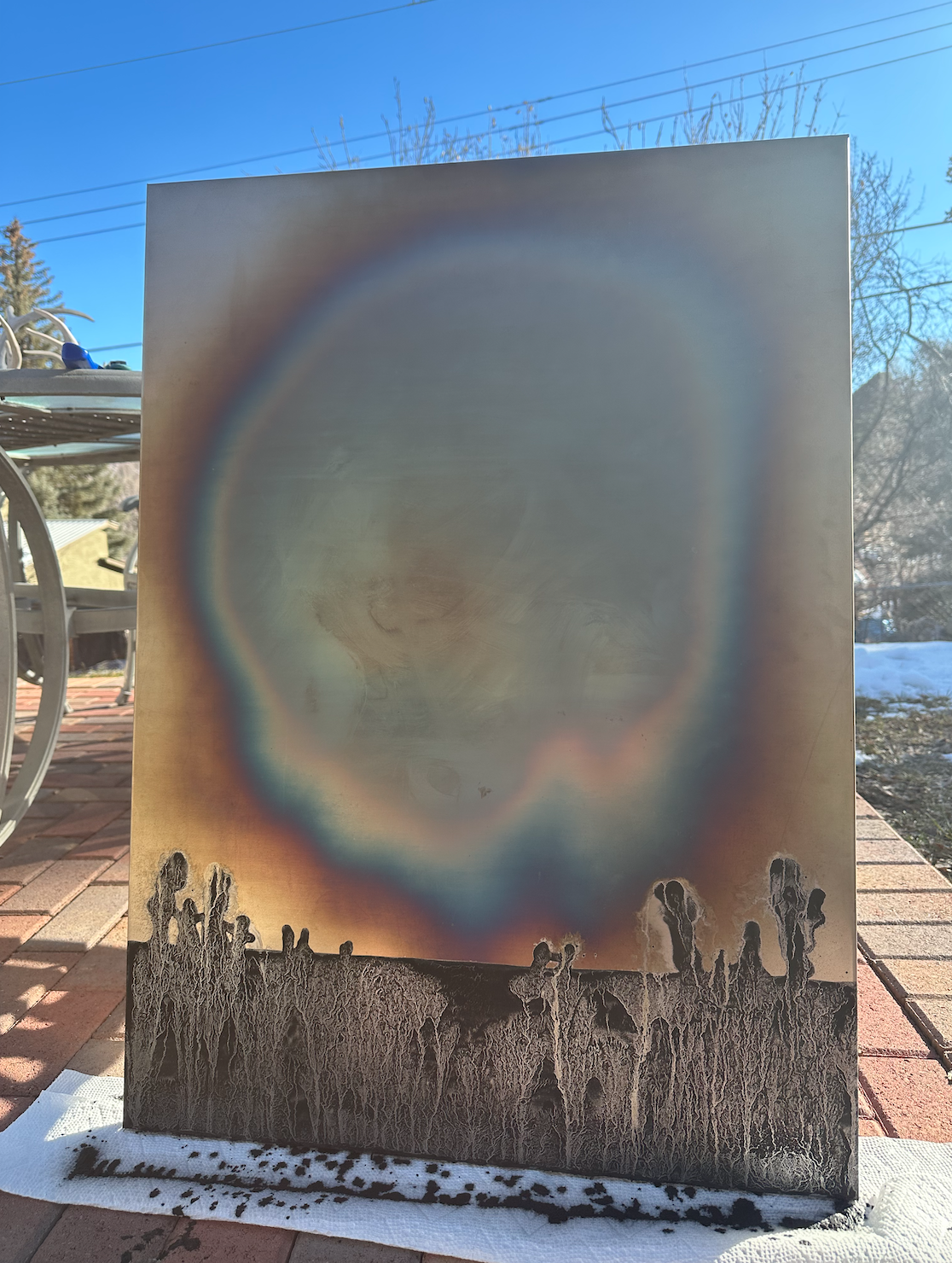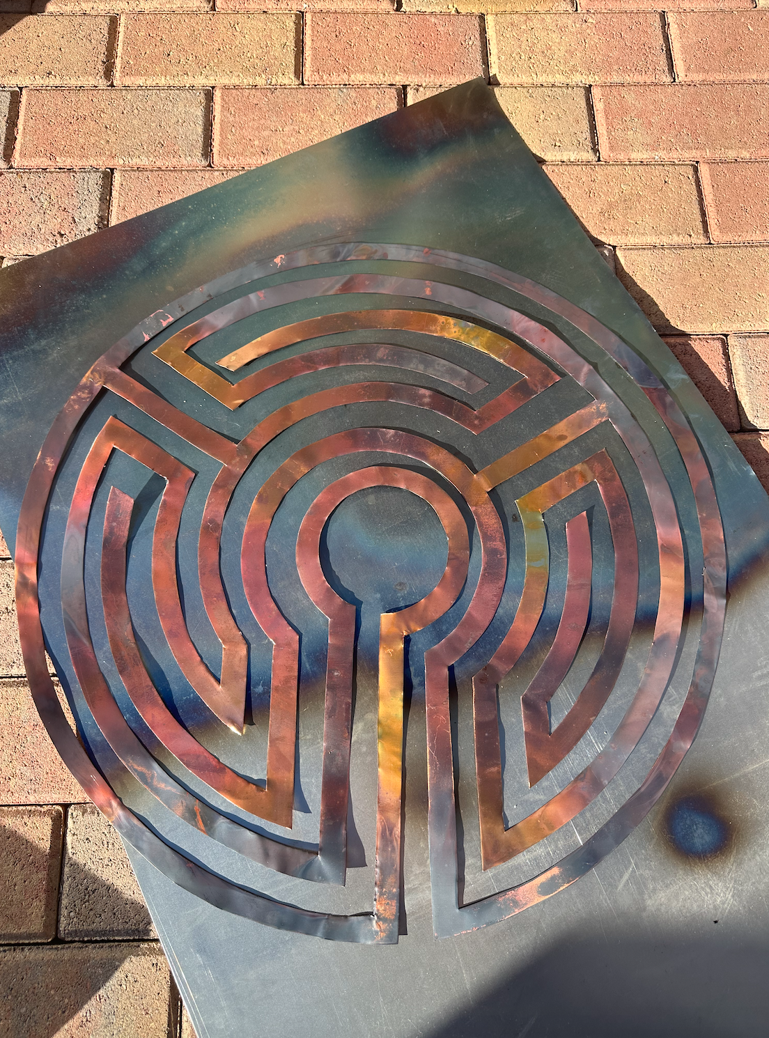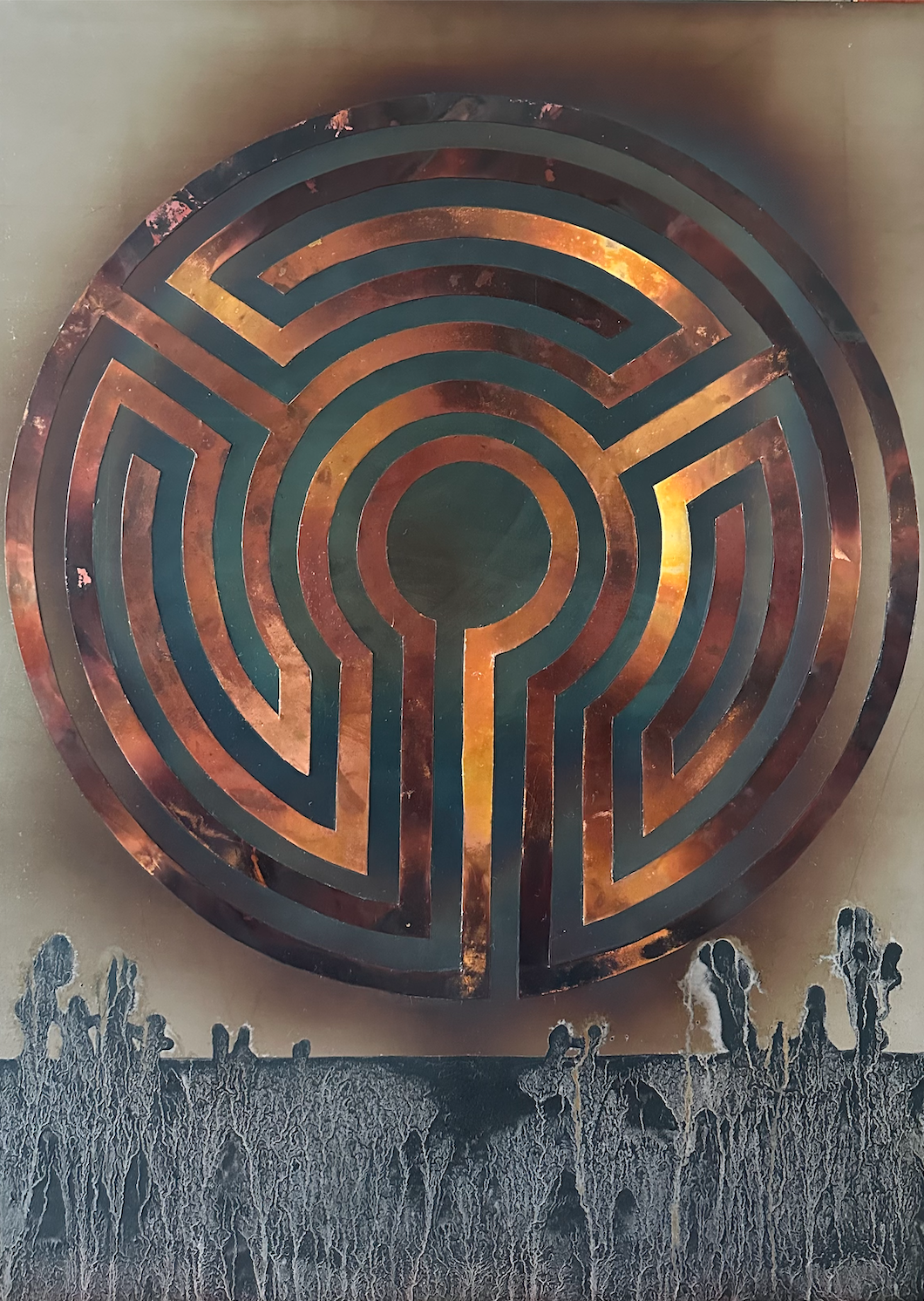 “Fifteen” - This 25” by 35” piece was created to celebrate the fifteenth anniversary of a local artist coop owned gallery, Studio&. The background is heat treated steel, with salts, acids, and charcoal creating the dramatic landscape. The Labyrinth is heat treated copper. For more information on the construction of this piece, click the photo.
