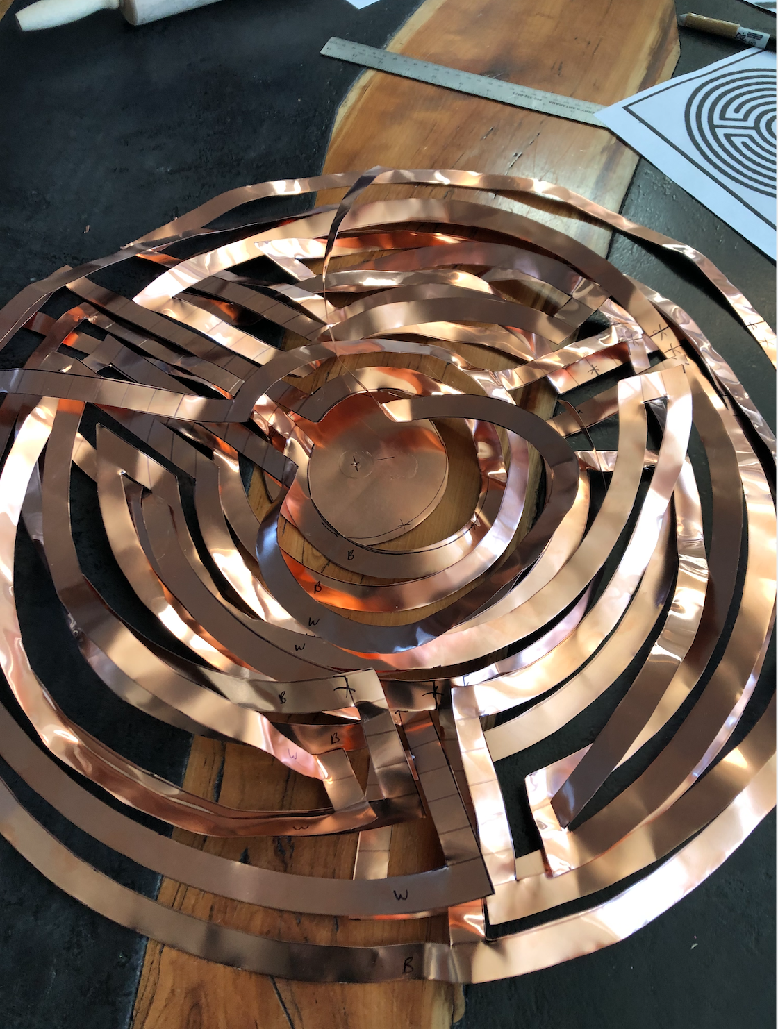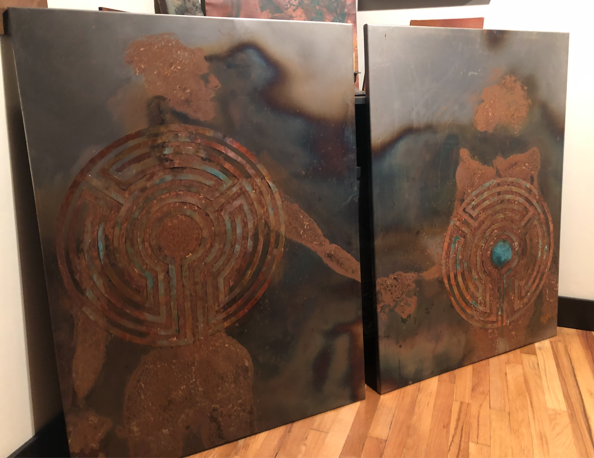 “The Lovers” - This diptych measures 73 inches wide and 47 inches tall when both pieces are hung together. It is made of heat treated steel and copper, with human body prints using skin safe salts and acids. The two labyrinths, one on the man and one on the woman, are cut from the same piece of copper. They are inverse of each other and fit together. The labyrinth on the man centered on his heart, symbolizing his heart forward energy. The labyrinth on the woman centered on her belly, indicative of both her womb and her intuition. The inspiration for this piece was in noticing the different energies I felt in the men and women around me at the time. I was also interested in exploring using the body prints across two different materials to create a unified shape in two different patinas, red iron oxide and turquoise from the oxidation of the copper.