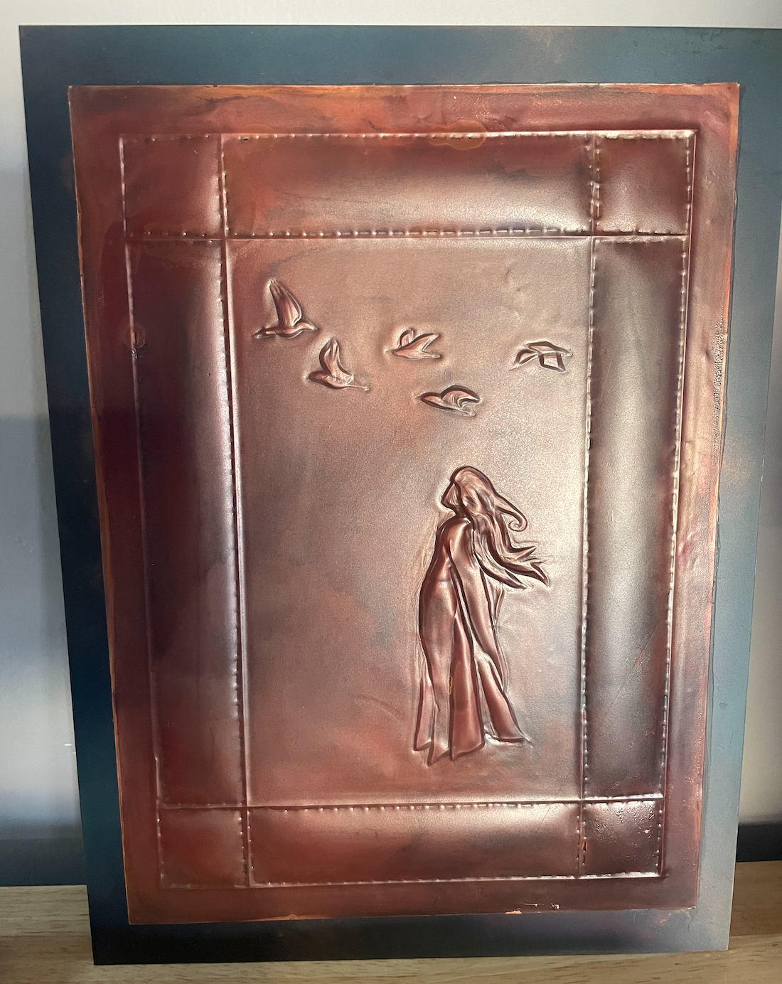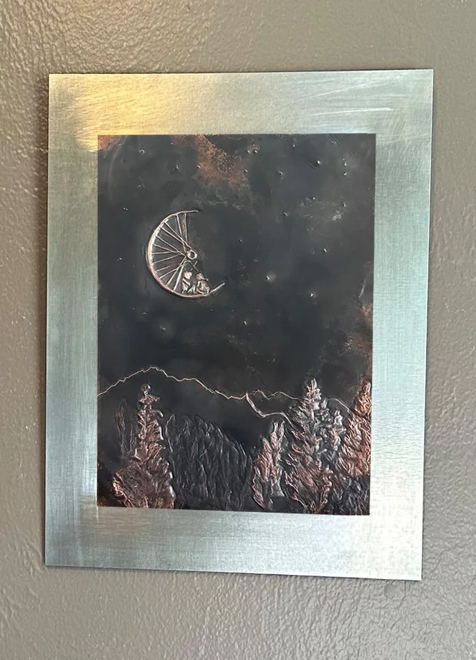 This 8” by 11: piece was created by hand embossing copper, and developing color with heat, before mounting on steel. It was donatied to the 2025 Durango Montessori School Charity Auction.