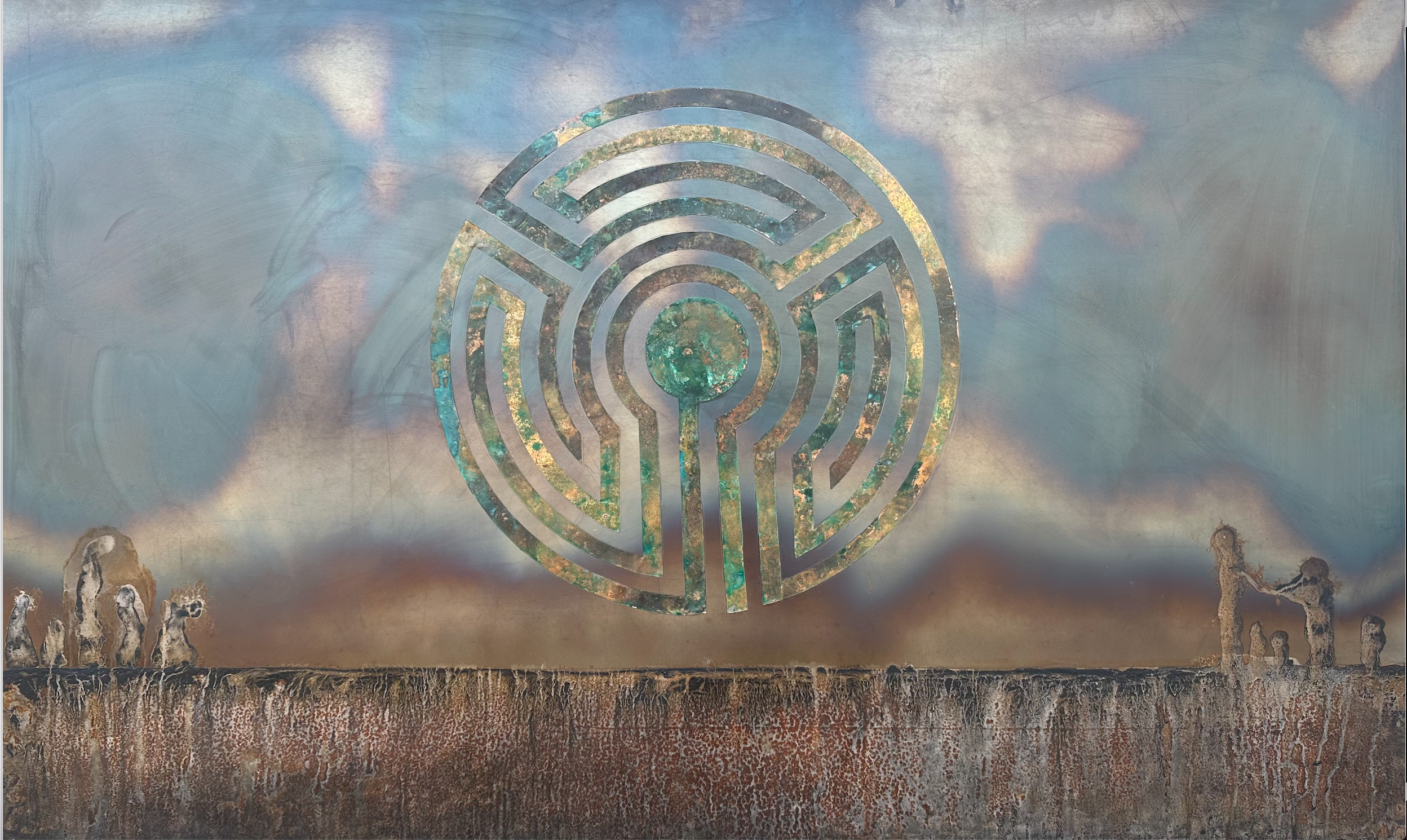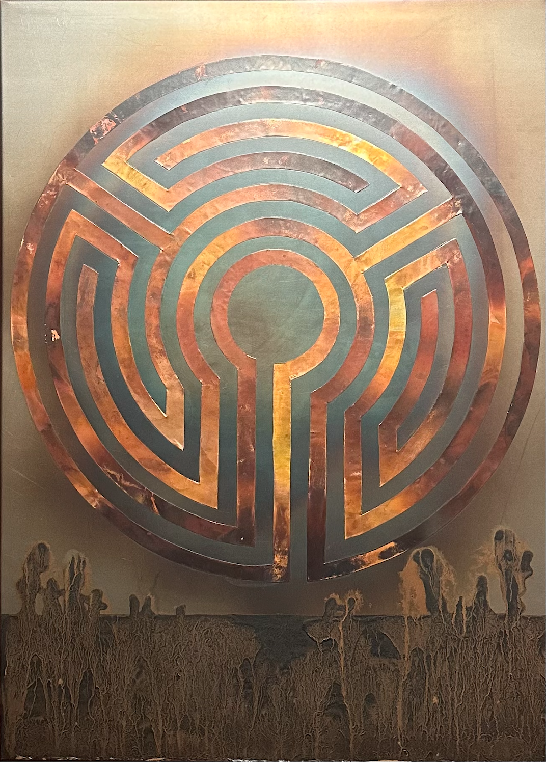 “Fifteen” - This 25” by 35” piece was created to celebrate the fifteenth anniversary of a local artist coop owned gallery, Studio&. The background is heat treated steel, with salts, acids, and charcoal creating the dramatic landscape. The Labyrinth is heat treated copper. For more information on the construction of this piece, click the photo.