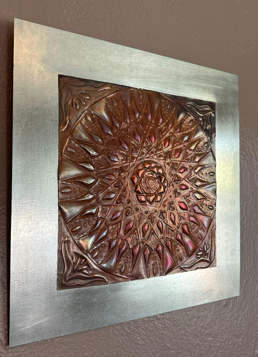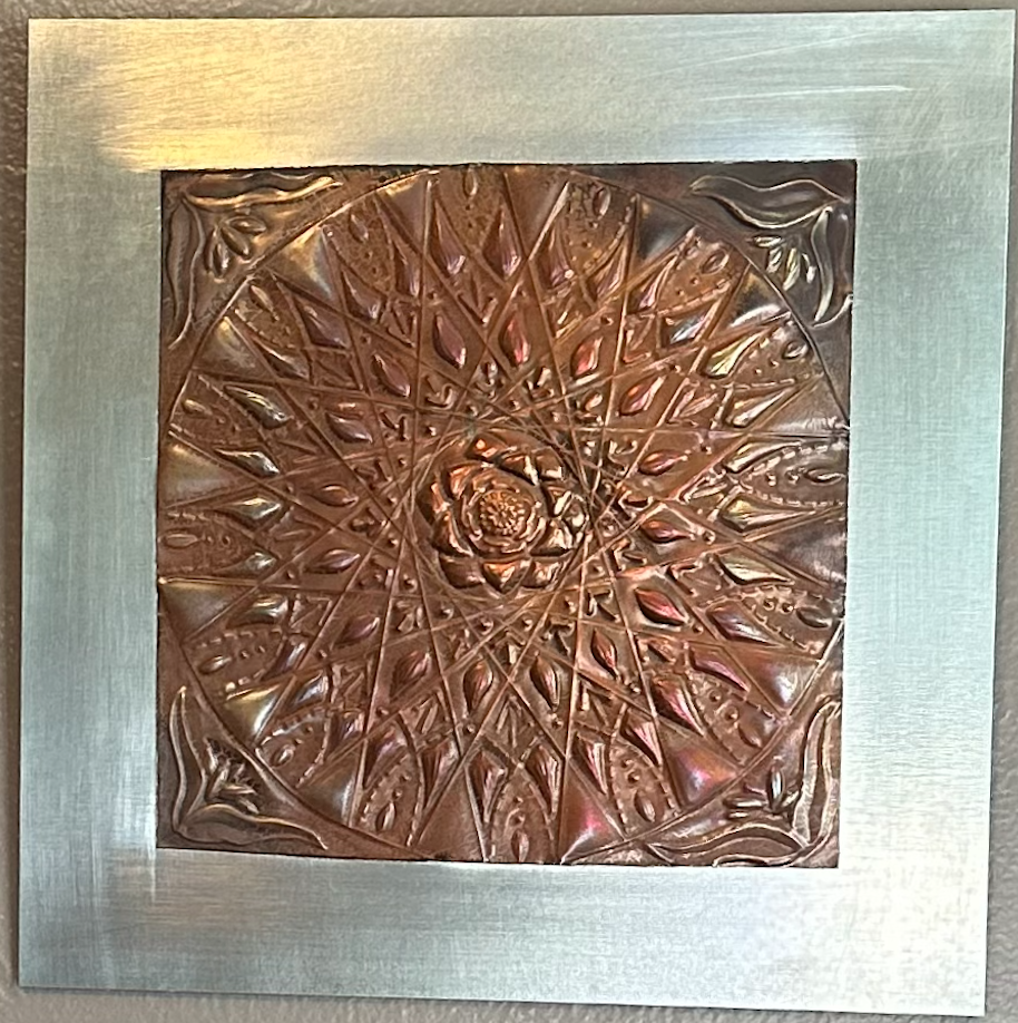 This 8” by 8” piece was inspired by both mandalas and bicycle spokes. It was hand embossed in copper and treated with heat to develop color. It was donated to the 2024 Durango Devo Charity Auction.